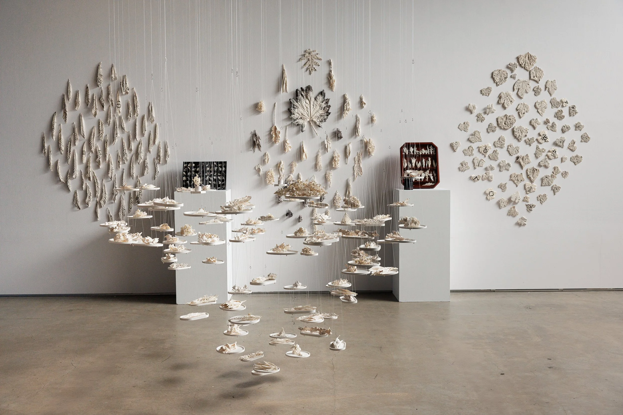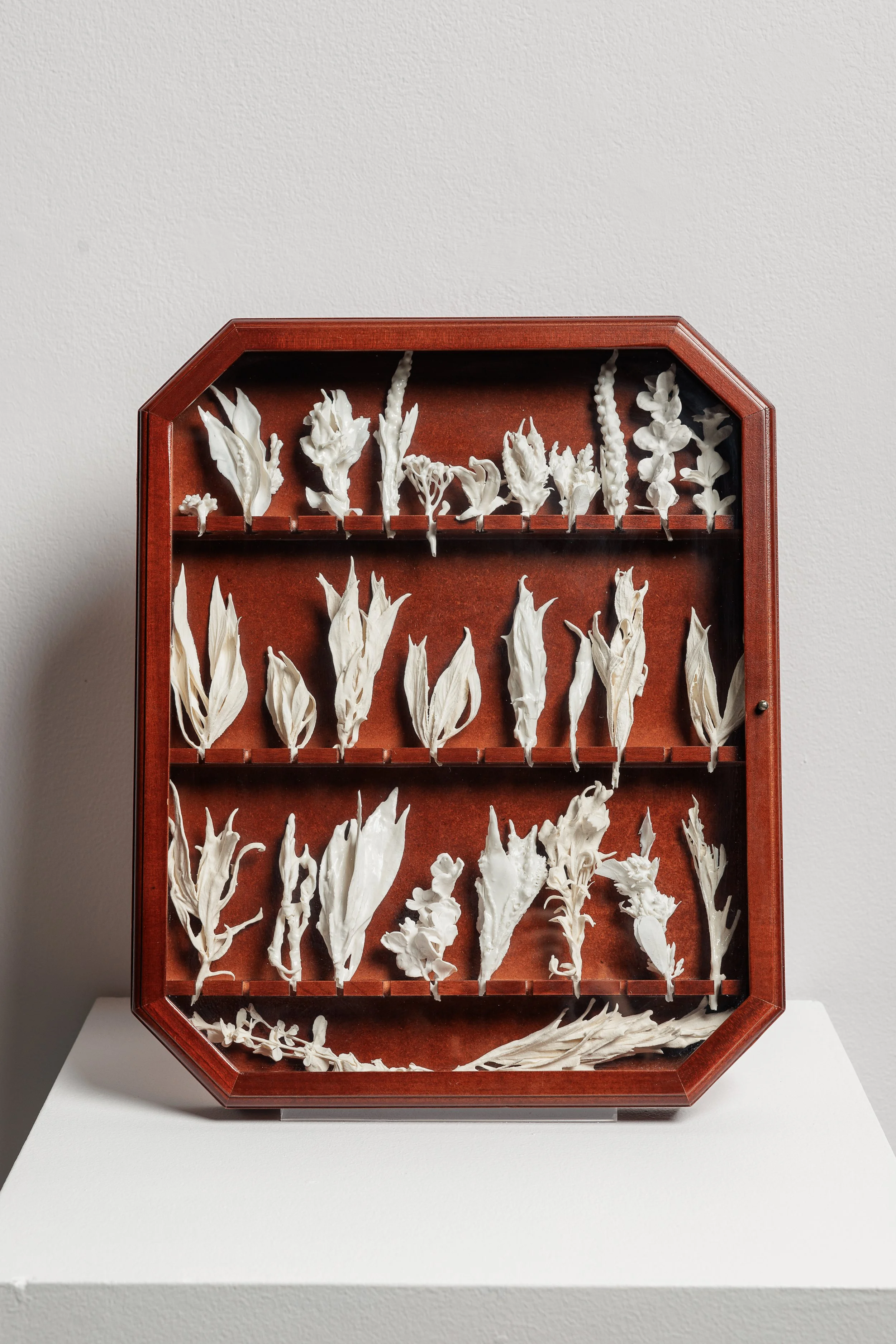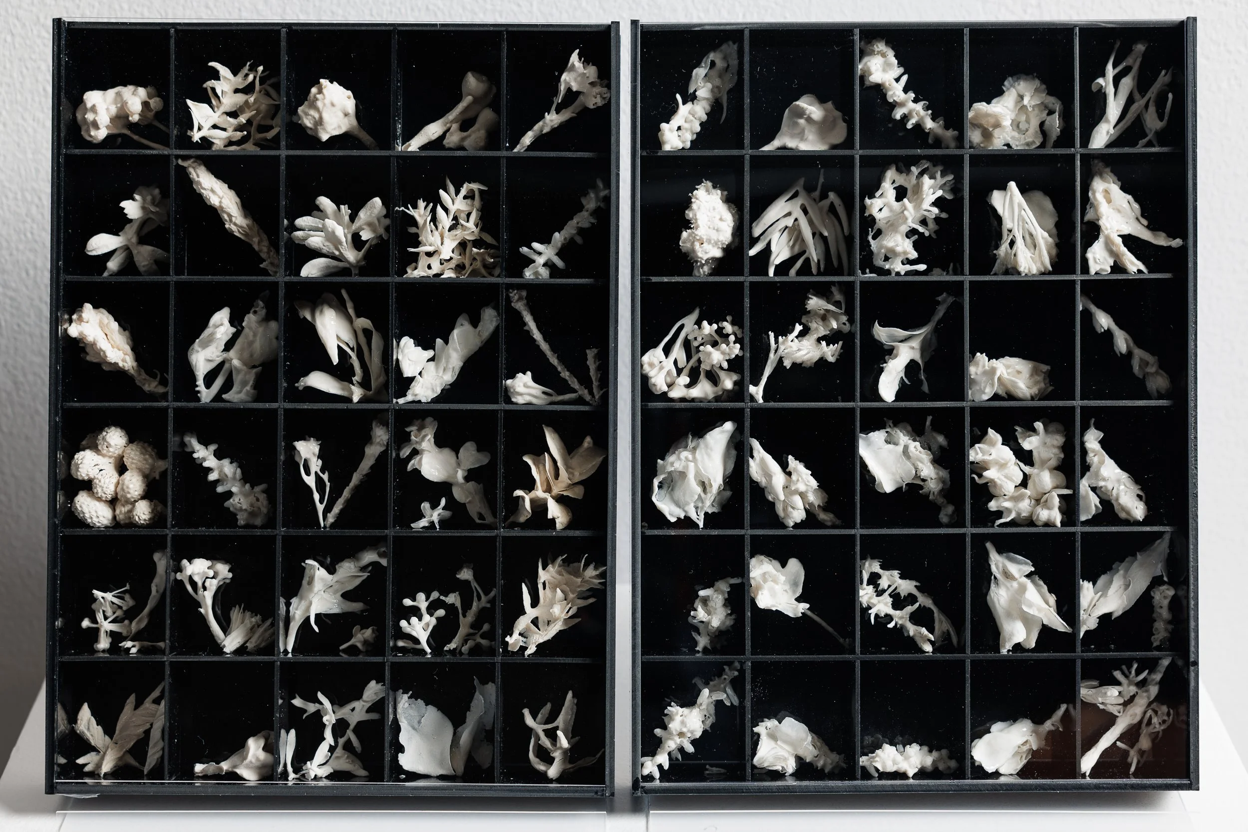 The work takes the form of a museum assemblage, where fragments of ultra-thin porcelain are carefully gathered, catalogued, and arranged within transparent vessels. Each piece sits suspended between fragility and preservation, echoing the quiet tension between memory, loss, and the impulse to collect what time has almost erased.